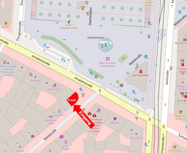 Die Praxis befindet sich ganz in der Nähe der zentralen Haltestelle Europaplatz/Postgalerie. Die Ubahnhaltestelle wird von den Linien 1, S2, S5/S51 und S1/S11 angefahren. Die oberirdische Haltestelle von den Linien 2, 3, 4 und S12.